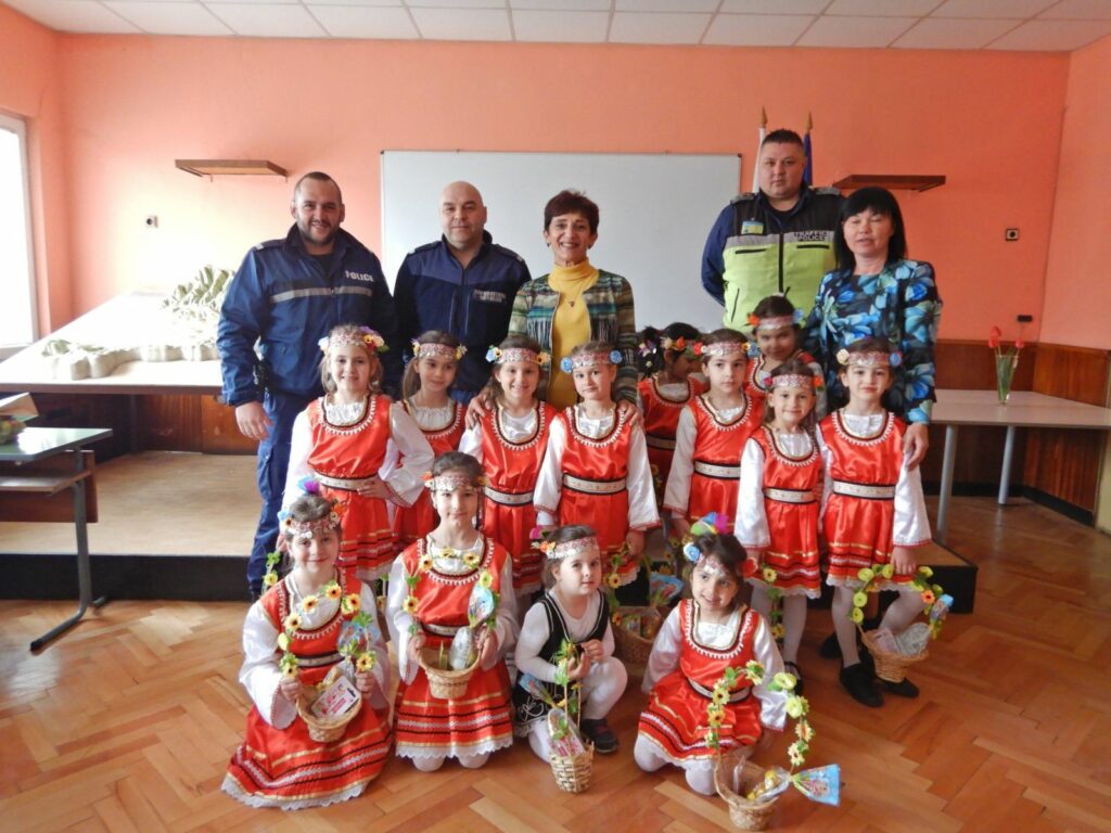 Началникът на РУ-то гл. инсп. Миглена Банова посрещна специалните гости от детска градина „Слънце“, които зарадваха целия състав със специално подготвена празнична програма. С песни и танци малките лазарки отправиха към служителите на реда своите пожелания за здраве и благополучие.