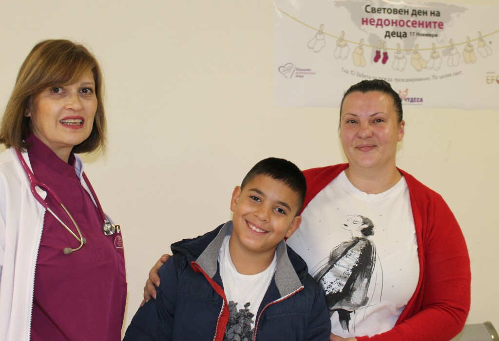 Росен, който вече е на 10 години, днес видя кувьозите с недоносени бебета и чу звука на мониторите, следящи жизнените им показатели. Момчето е родено в УМБАЛ-Бургас точно преди десет години и е един от най-тежките пациенти на Отделението по неонатология. Майка му Катерина Методиева го доведе, за да поздравят заедно екипа по повод Световния ден на недоносените деца и да му покаже къде е прекарал първите месеци от живота си, а той да разкаже, че обича да играе народни танци, а българският му върви повече от математиката.