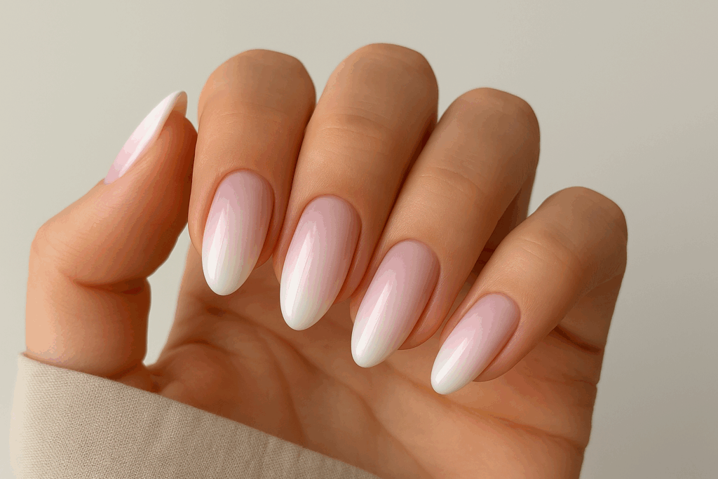 Млечен омбре: от млечно бяло към полупрозрачни телесни нюанси – предпочитан за булчински маникюр.