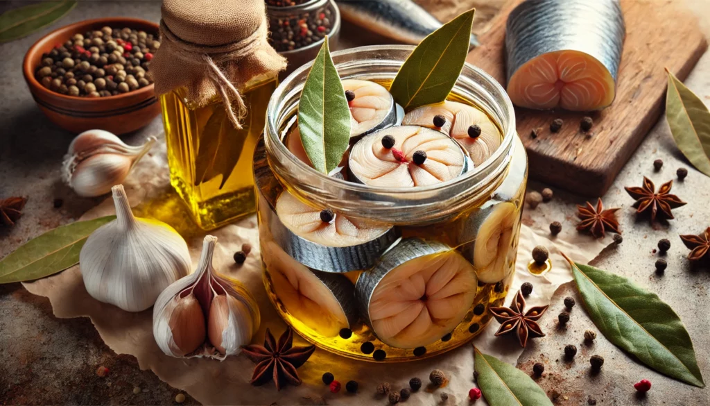 Мариноване: Подредете шайбите риба в буркани или кутии с плътно затварящи се капаци. На дъното налейте малко олио и добавете подправки – зърна бахар, черен пипер и дафинови листа. Залейте с охладено олио, докато рибата е напълно покрита.