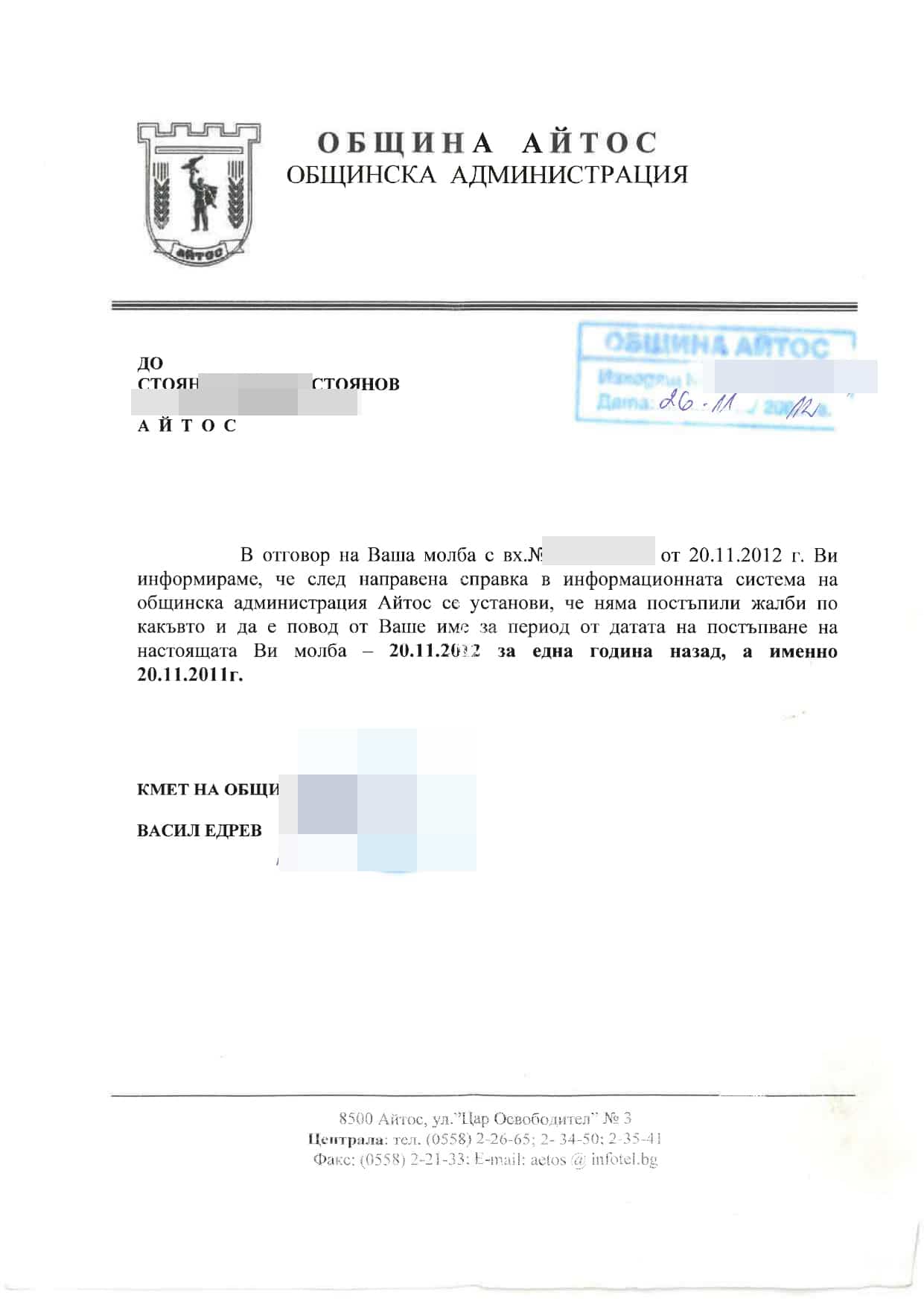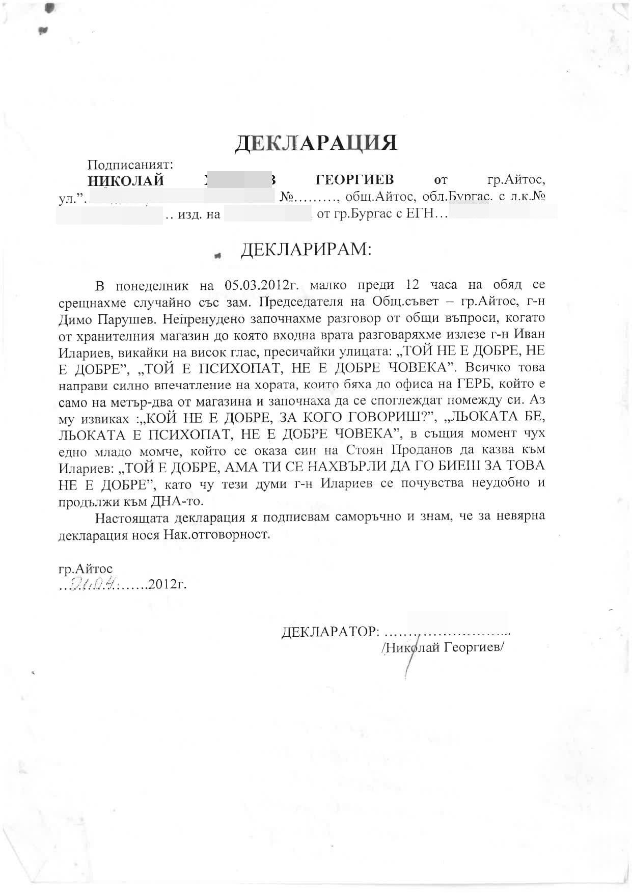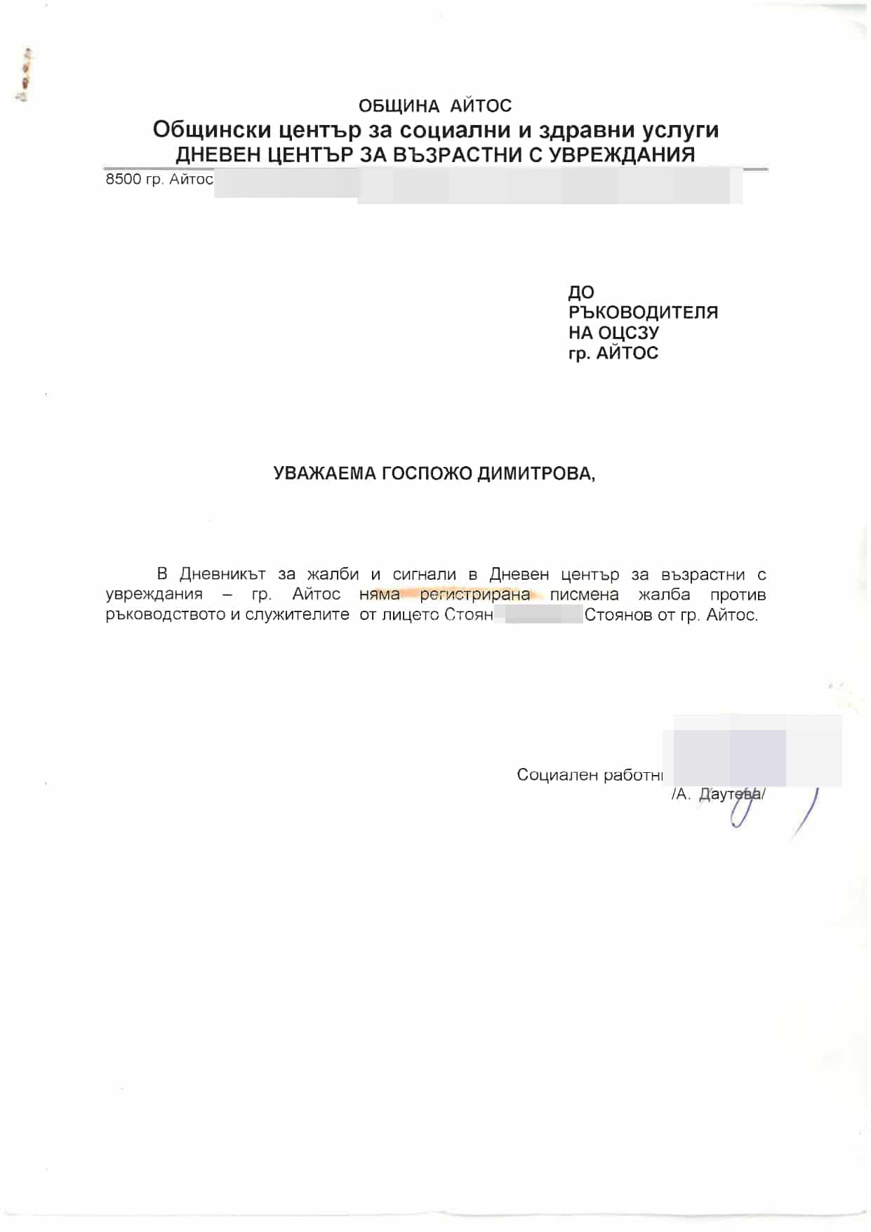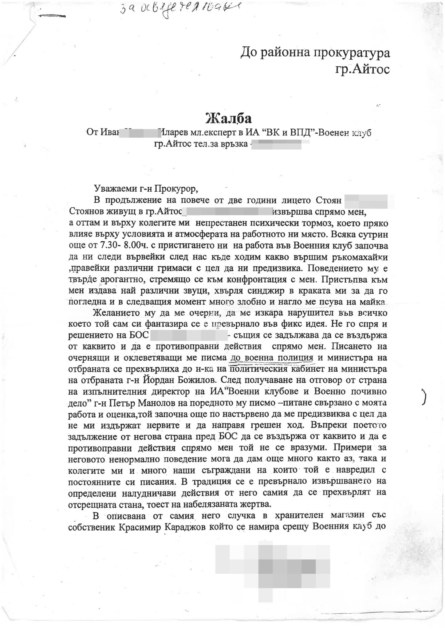 В редакцията на Искра.бг постъпи сигнал за поведението на началника на Военния клуб в Айтос Иван Иларев. Стоян Стоянов, който е отговарял за Дневния център, твърди, че е бил обиждан и заплашван от въпросния ръководител. За всичко това има и свидетели, които писмено са потвърдили думите на потърпевшия.