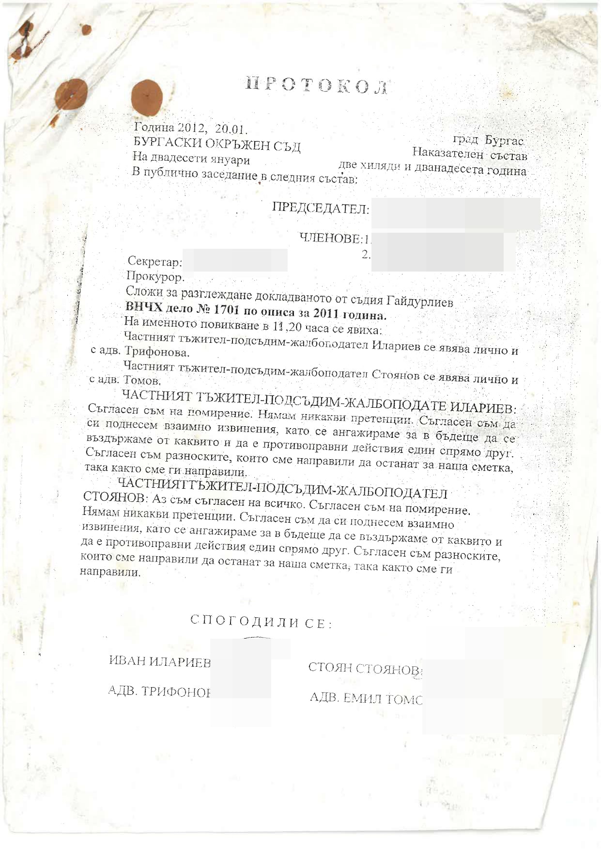„Бяхме трима човека. В съда станаха шест заедно с подчинените на Иларев. Каза ми „Ще те смачкам!“, „Аз съм полковник!“, „Ще станем на кълбо!“. Тези двама свидетели имат декларация. Разпитани са от съда“, обясни Стоянов.