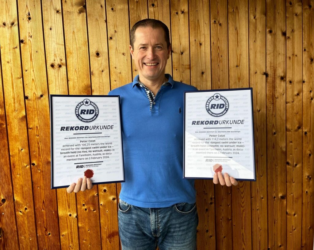 Ветеранът фрийдайвър Питър Колат /Швейцария/ подобри два световни рекорда на Гинес, преплувайки над 100 метра на един дъх под повърхността на замръзнало езеро. Той преодоля разстоянието веднъж, носейки единствено плувни шорти и един път използвайки монофин /вид плавник/, постигайки два варианта на най-дългото плуване под лед със задържан дъх. Той изплува 106,25 м с плувните си шорти, подобрявайки предишния рекорд с 25 м, а с монофин достигна 114,2 м, почти 4 м повече от предишния запис.