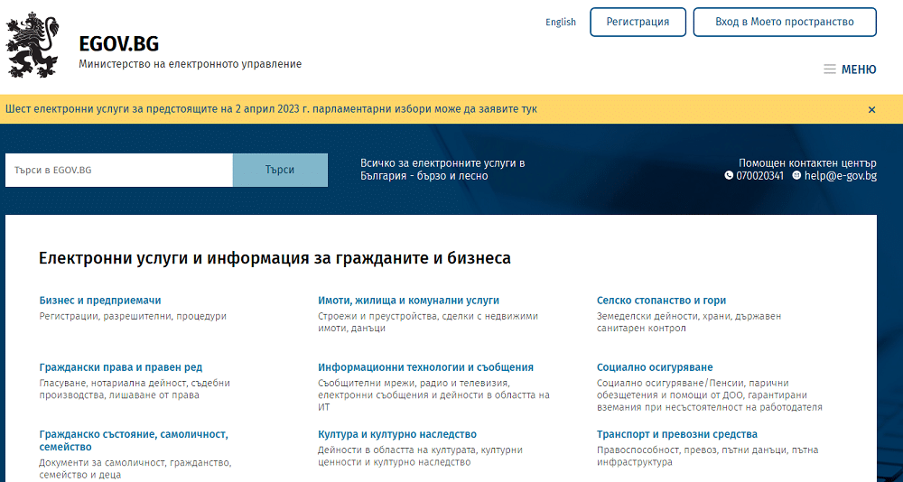 Шест електронни услуги за предстоящите на 2 април 2023 г. парламентарни избори са публикувани на Портала за електронни административни услуги на Министерство на електронното управление, съобщиха от ведомството. Те се предоставят от общински администрации. За да се заявят електронно, е необходимо да се притежава Квалифициран електронен подпис /КЕП/ и профил в системата „Електронно връчване“.