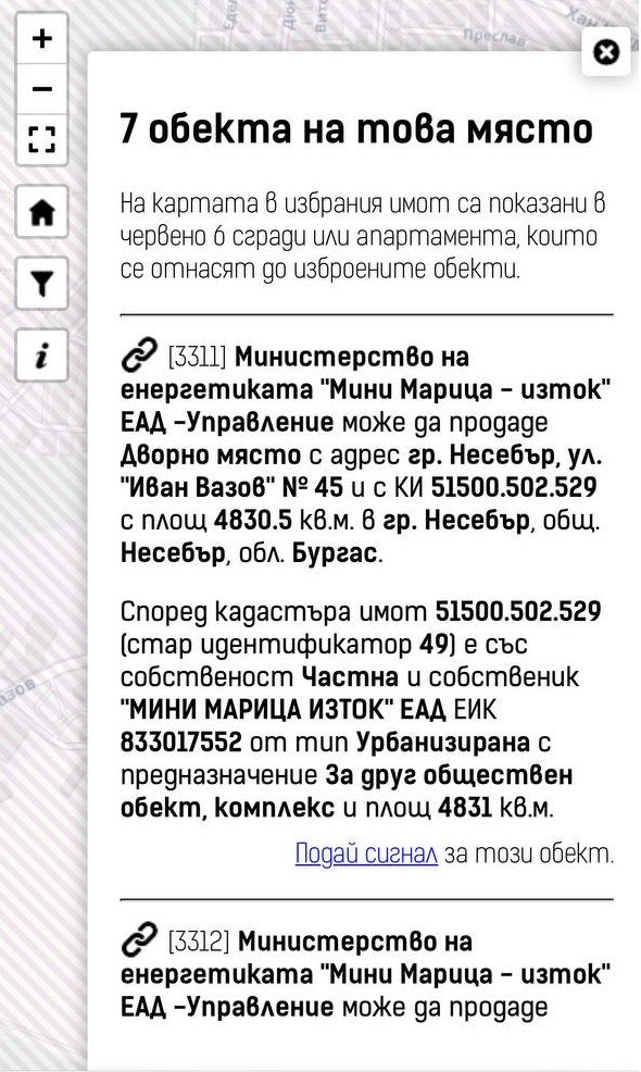 В централната част на Несебър, на ул. „Иван Вазов“ № 45, се намира комплекс от сгради и терени, собственост на държавното дружество „Мини Марица – изток“ ЕАД към Министерството на енергетиката. Според справка в картата на Боян Юруков общо седем обекта на това място са включени в списък за продажба, като част от държавна програма за разпореждане с имоти, определени с „отпаднала необходимост“.