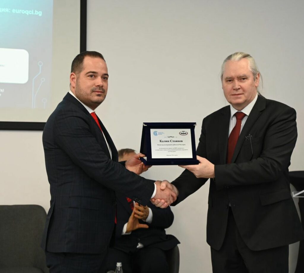 Министърът на вътрешните работи Калин Стоянов получи днес почетен плакет и грамота за високия принос на МВР в развитието на квантовите технологии и комуникационния суверенитет на Република България. Отличието връчи професор Август Иванов, директор на Института по роботика на БАН, в рамките на посещение на Националния център за квантова комуникация, интелигентни системи за сигурност и управление на риска – КВАЗАР.