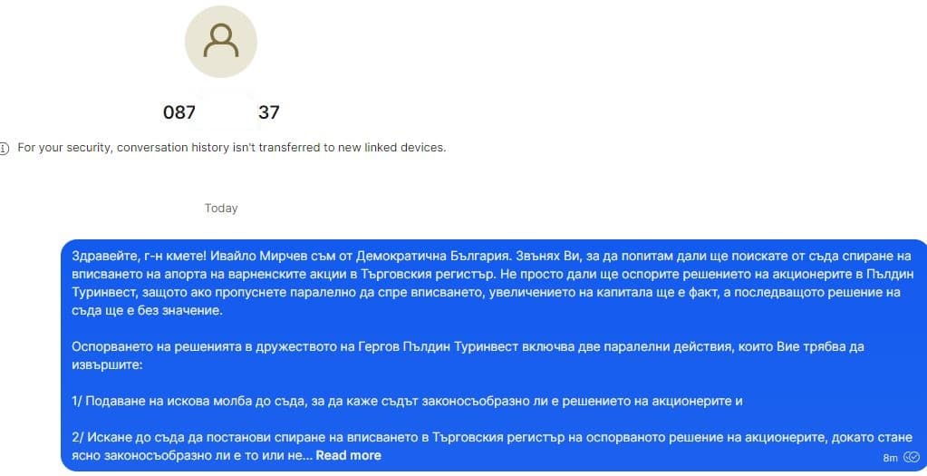 „Здравейте, г-н кмете! Ивайло Мирчев съм от „Демократична България“. Звънях Ви, за да попитам дали ще поискате от съда спиране на вписването на апорта на варненските акции в Търговския регистър. Не просто дали ще оспорите решението на акционерите в „Пълдин Туринвест“, защото ако пропуснете паралелно да спре вписването, увеличението на капитала ще е факт, а последващото решение на съда ще е без значение.