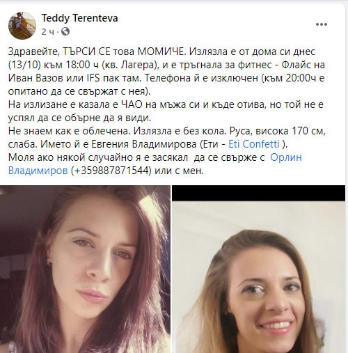 Тя се казва Евгения Владимирова и е излязла от дома си около 18:00 часа. Казала е „чао“ на мъжа си и къде отива – към фитнес „Флайс“ на Иван Вазов или IFS, който се намира отново там. Той не е успял да се обърне и да я види и така близките й не знаят как е била облечена.