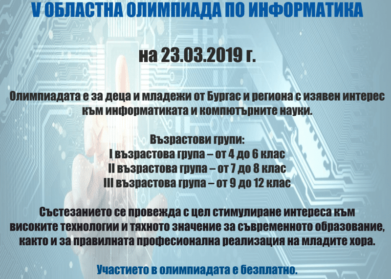Млади IT-специалисти ще мерят умения на Петата областна олимпиада по информатика и нови технологии на 23 март в Бургаския свободен университет. Началото на състезанието е в 09:00 часа.