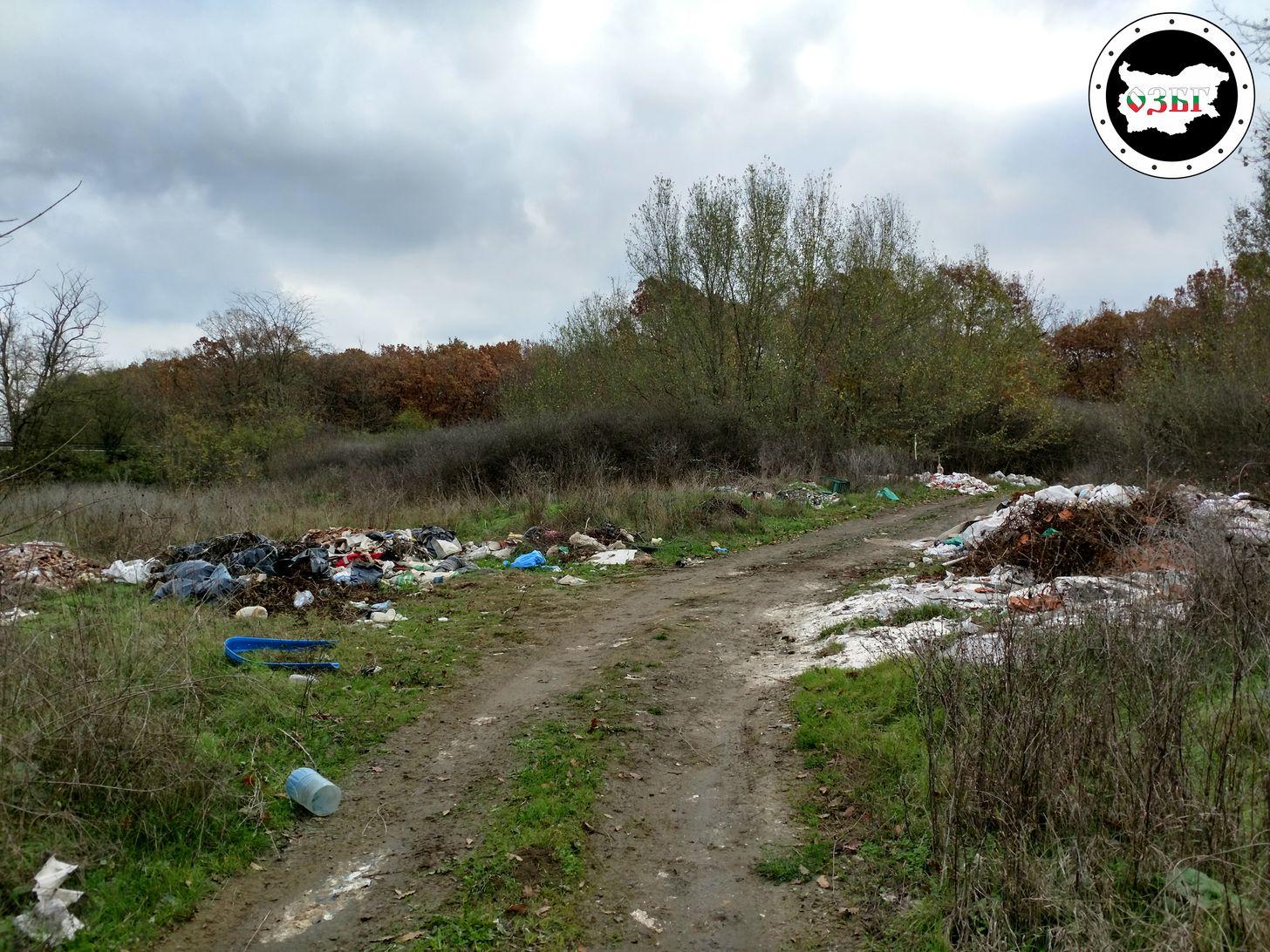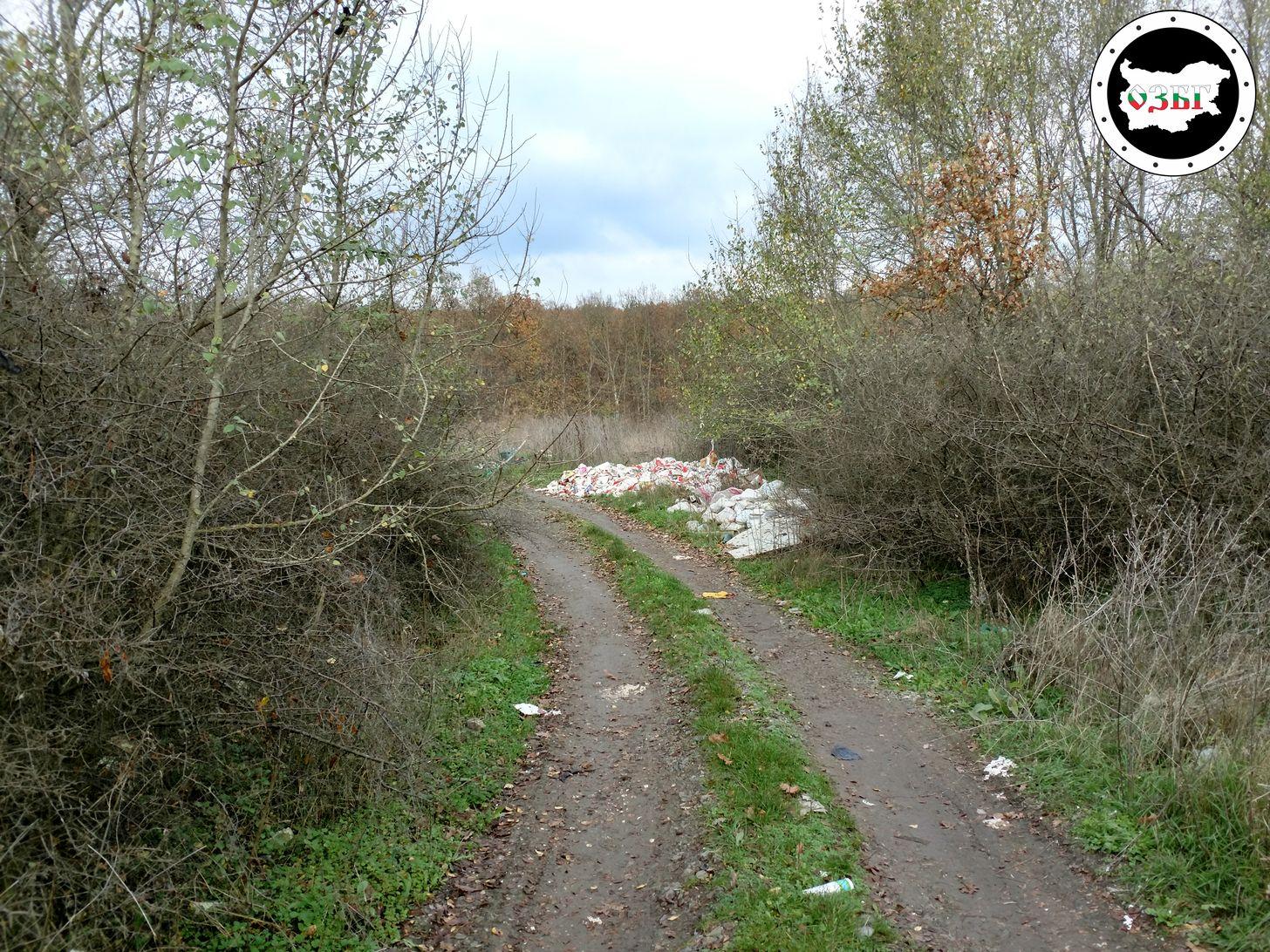 При влизане в горепосочената отбивка, пътят стига до купчината на снимка 1 и прави десен завой. Зад купчината има още строителни отпадъци, които се виждат на снимка 2. Но, за да се видят, е нужно човек да се качи на купчината.