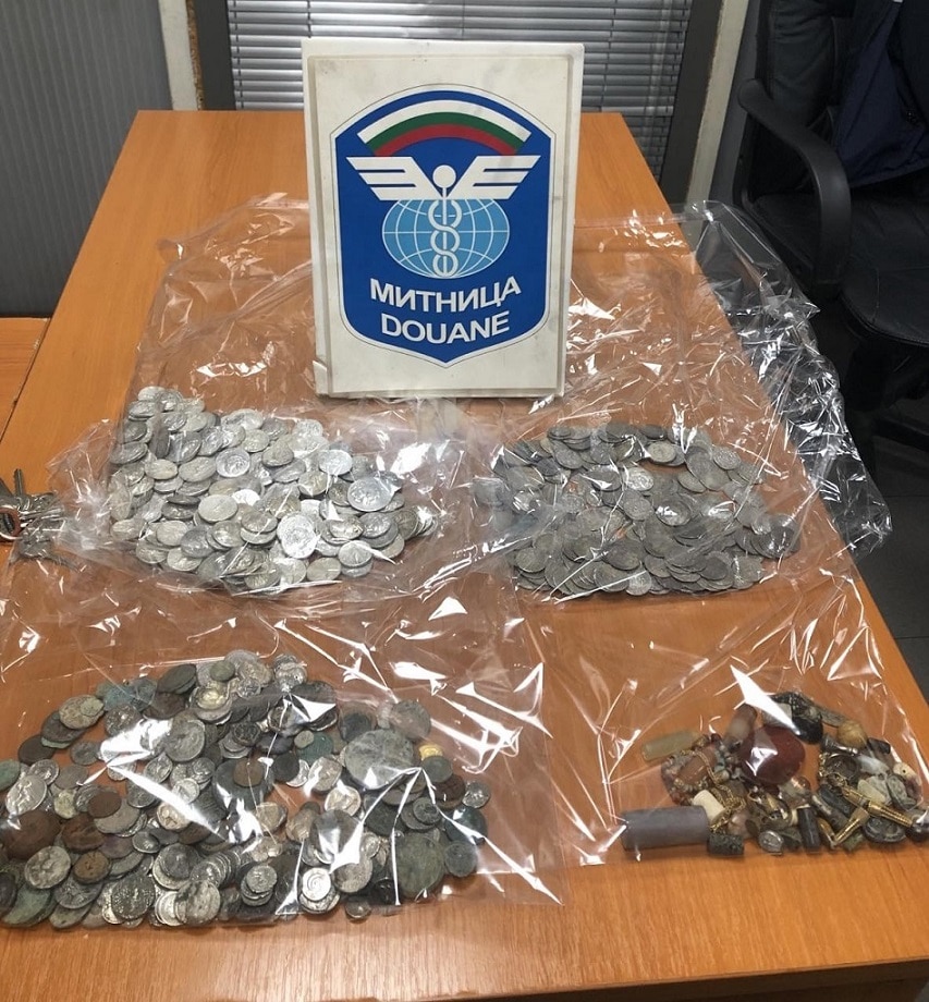 При извършената проверка митническите служители са открили под акумулаторите на превозното средство укрити пет пакета, опаковани с тиксо. Установено е, че те съдържат 716 старинни на вид монети от бял и цветен метал, както и 45 броя старинни накити и предмети, сред които пръстени, медальони, обеци, фигурки, плочки, печати, два овални червени камъка.