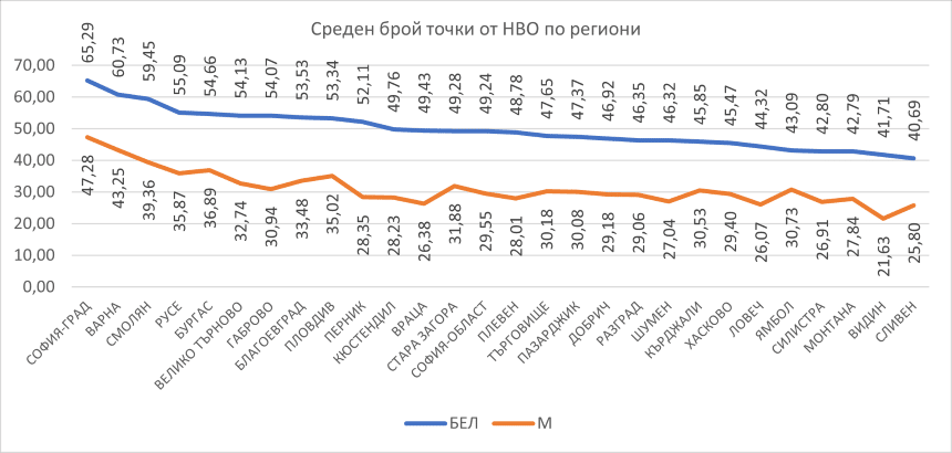 Сред регионите с най-висок среден брой точки и по двата предмета отново са София-град, Варна и Смолян. Най-нисък е средният резултат в Сливен, Видин и Силистра, като през тази година към тях се присъединява и Монтана.