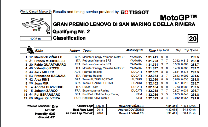 Първи от втора редица на „Мизано“ утре ще потегли ветеранът и многократен световен шампион в MotoGP Валентино Роси, който затвърди уникалното представяне на машините на Yamaha в челото днес. 9-кратният носител на титлата регистрира пасив от 0.466 секунди за 4-тата позиция, а топ 5 допълни Джак Милър (Pramac Ducati, +0.641 секунди). Втора редица ще оформи съотборникът му Франческо Баная (+0.643 секунди).