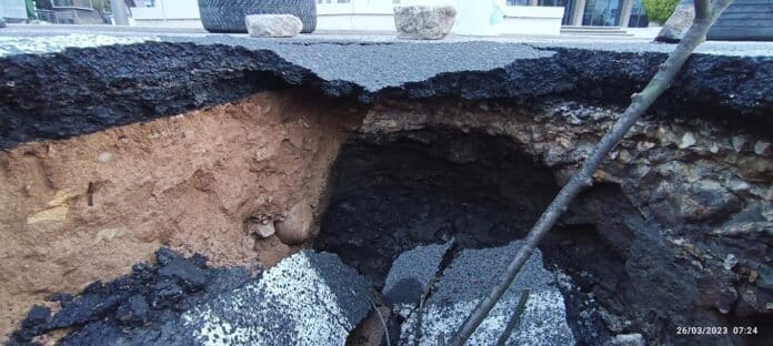 Видео, разпространено в интернет, показва момента, в който шосето се е свлякло в близост до кръстовище. На него се вижда как мотоциклетистът пада в дупката, а автомобилът, който се движи пред него, едва се измъква от нея.