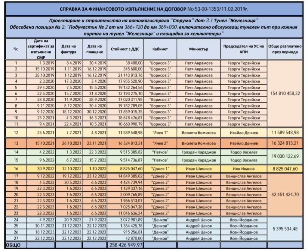 Министерство на регионалното развитие и благоустройството предоставя пълна справка за всички плащания по реализацията на тунел „Железница“ на АМ „Струма“.