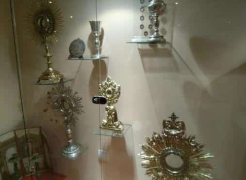 Интересен щрих от сбирката е колекцията от красиво изработени разнообразни остенсории, които се ползват при богослуженията. Както е известно, всеки от тези предмети е уникален/неповторим по отношение на вложените материали / злато или сребро /, и тегло, както и дизайн. Външната форма наподобява слънцето в своя пълен блясък, с очертан вътрешен кръг, в който се поставят различни реликви и предмети / дарове / на благочестие, поставена върху стойка с прикрепен Христов кръст .Самата дума „остендере“ означава „показвам“. Обикновено се представят реликви на светци по време на литургии, или осветени късове хляб по време на евхаристията, означаващи тялото на Христос. В литургията свещеникът благославя множеството именно чрез Христос, показвайки монстранцията/остенсориумът.