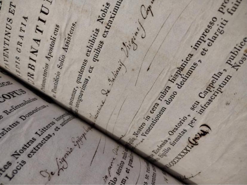 Реликвите и реликвариите са друг важен богослужебен инвентар и натоварен със символика знак за светост на мястото. Известно е, че при строежа на църква, конгрегацията изпраща специални свети мощи със свидетелство за тяхната автентичност. Подобен документ е открит през март 2022 г. в архива на католическата църква „Св. Франциск от Асизи“ в с. Белозем, който любезно е предоставен на автора за физически оглед и за снимка по диагонал. Документът е с дата 1841 г. (вж. фиг. 6) и официализира възможността в новостроящият се храм през същата година, да бъдат вградени мощите на двама светци в централната основа на олтара / Св. Алфонс и Света Вероника де Джулиани от ордена на капуцините/.