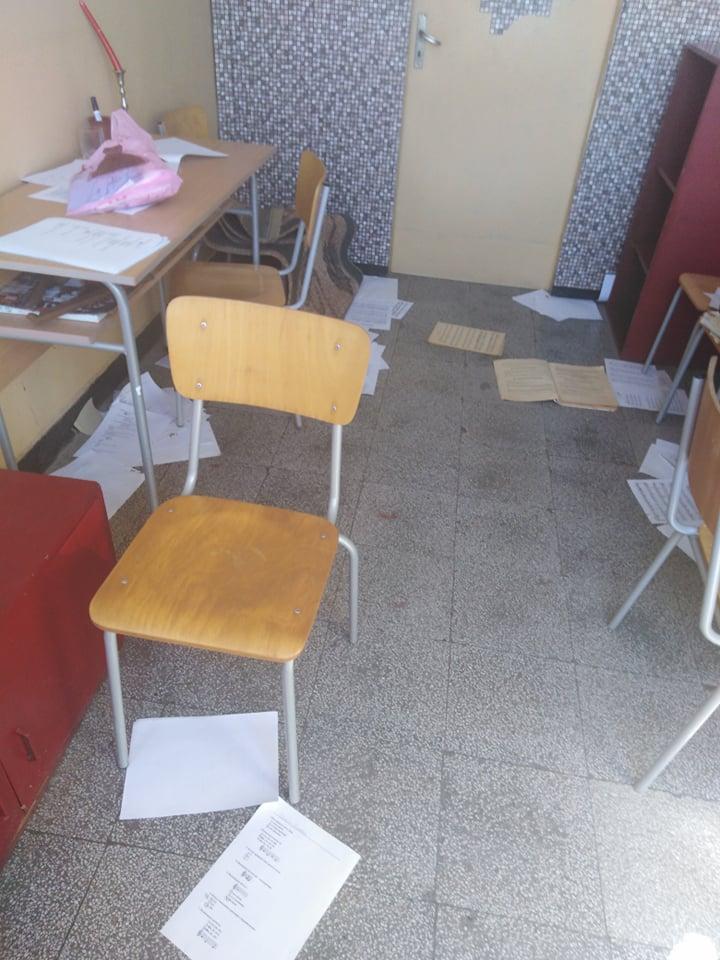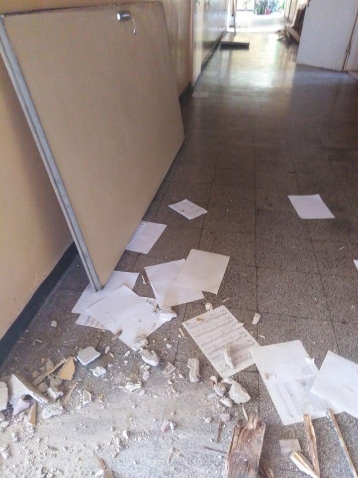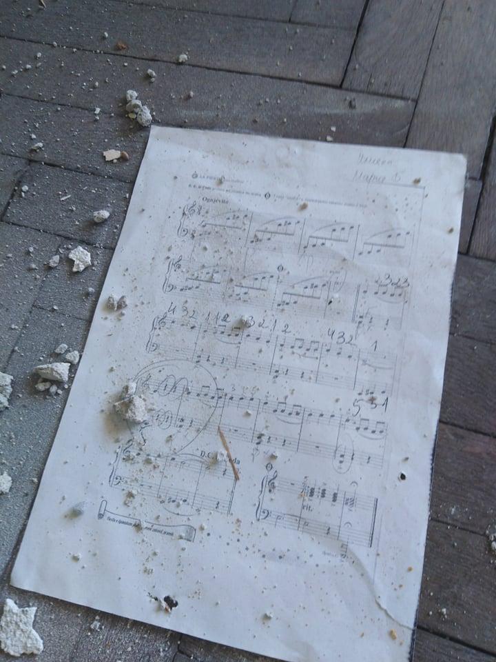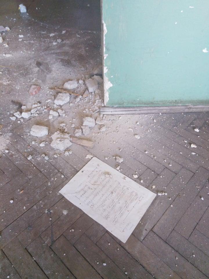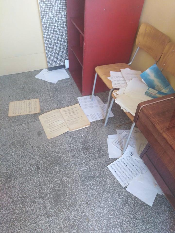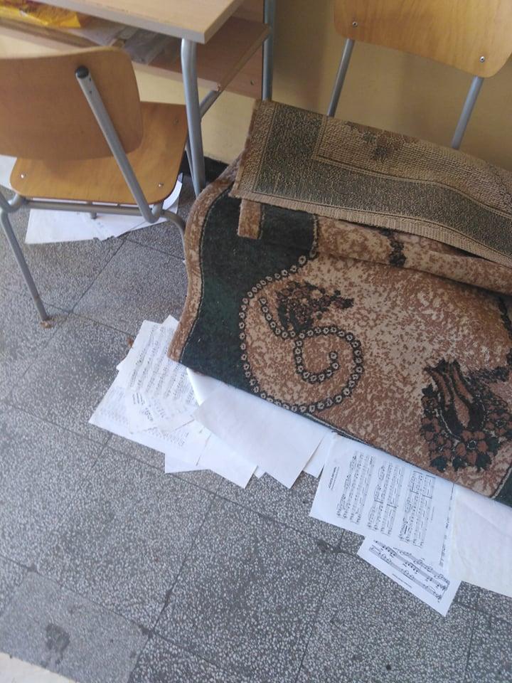 След като вчера ни съобщиха, че имаме 5 дни да си приберем материалите от училище, днес сутринта онемях от това, което видях. Имах чувството, че сънувам грозен филм! Листите ми с ноти, които съм събирала с години, бяха разпръснати по целия коридор – под шкафове, столове, дъски, врати, цимент и прах. Може би ако бях закъсняла, работниците щяха да обядват върху тях! Навсякъде разхвърляни врати, дъски със стърчащи пирони, стъкла…