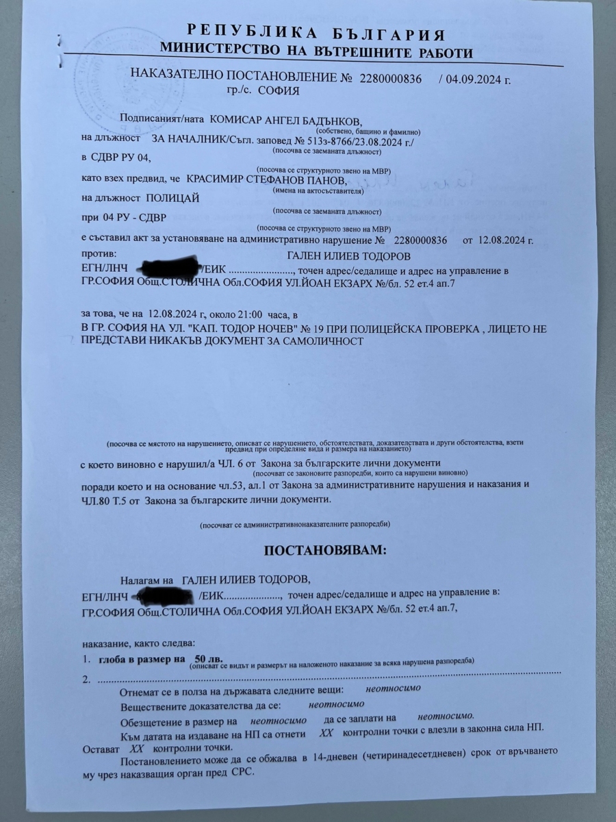 Пред 2 дни от 4-то РПУ ми се обадиха за моята гражданска позиция, за която съм санкциониран с 50 лева!!