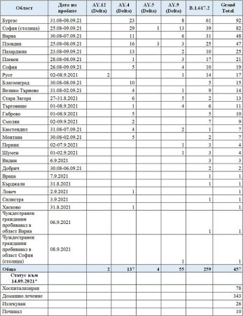 Националният център по заразни и паразитни болести анализира чрез целогеномно секвениране 457 клинични проби със SARS-CoV-2. При всички проби е установен „Делта“ вариантът, известен като Индийски вариант.