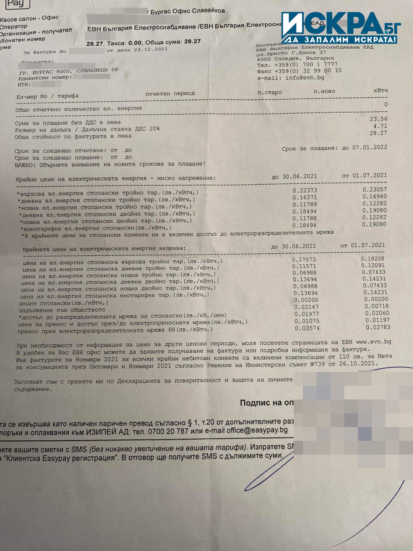 Умишлено начисляване на сметката за ток или недоглеждане от страна на EVN? Как така двама абонати, живеещи на един и същ адрес, бяха таксувани по различен начин за един и същ отчетен период? Този въпрос отправи видният бургаски общественик Николай Димитров, който се свърза с Искра.бг, за да разгласи случая.