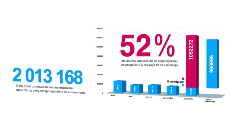 Общият брой на изтеглените COVID сертификати през Националната здравно-информационна система надхвърли 2 млн. броя. Само за последните 10 дни, когато бяха въведени новите противоепидемични мерки, потребителите са изтеглили общо над 1.05 млн. документа, което е 55% от общия брой сертификати. Системата за генериране на сертификати беше пусната в експлоатация на 1 юни.