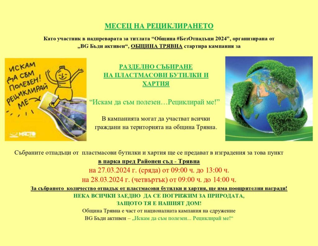 В Трявна стартира кампания за разделно събиране на пластмасови бутилки и хартия – „Искам да съм полезен…Рециклирай ме!“, съобщиха от местната администрация.