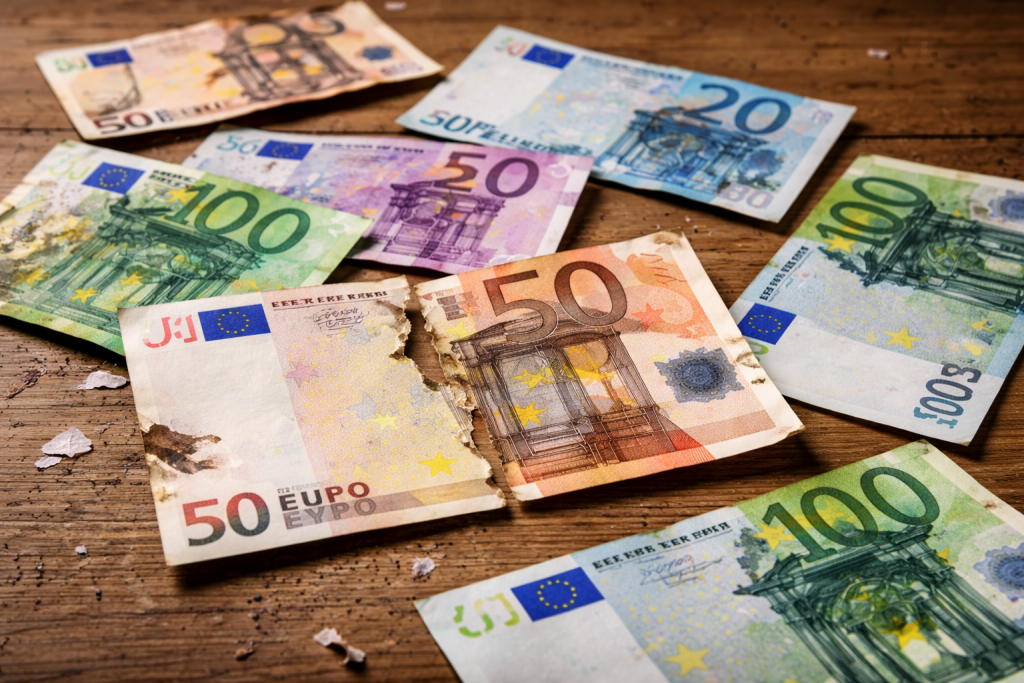 Надраскани и повредени евробанкноти. Снимка: Искра.бг
