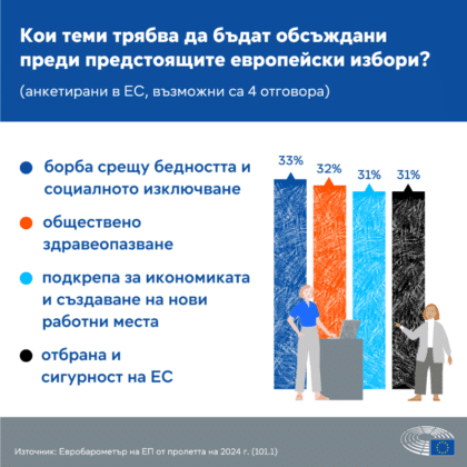 Европейците насочват вниманието си към въпросите на отбраната и сигурността. Този приоритет се увеличава, а в девет държави членки той е посочен като основен в предизборната кампания. Важни теми остават борбата срещу бедността и социалното изключване, както и общественото здравеопазване.