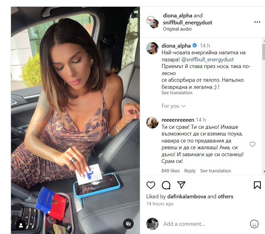 През последната седмица певицата Диона публикува рекламен видеоклип, на който смърка енергийна напитка под формата на прах. Видеото предизвика вълна от възмущение и недоволство както в социалните мрежи, така и в обществения и политически живот у нас. Последваха редица проверки от страна на институциите, като в петък здравният министър разпореди спешни проверки на РЗИ за продажбата на енергиен прах. Проверките ще се реализират съвместно с представители на Комисията за защита на потребителите.