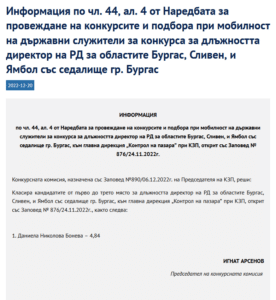 До конкурса са били допуснати петима души. Той се е провел на 19 декември 2022 година в Комисия за защита на потребителите-София. Кандидатите са се борили за заемане на една щатна бройка.