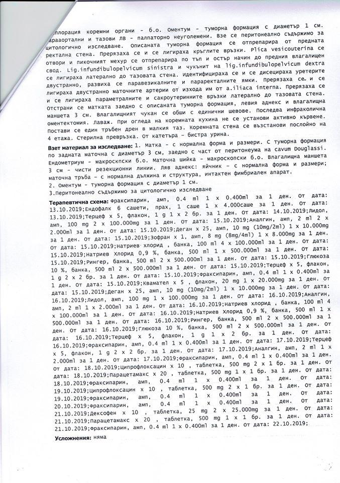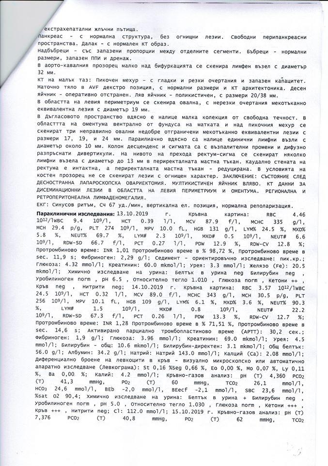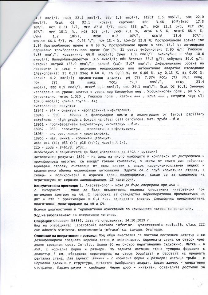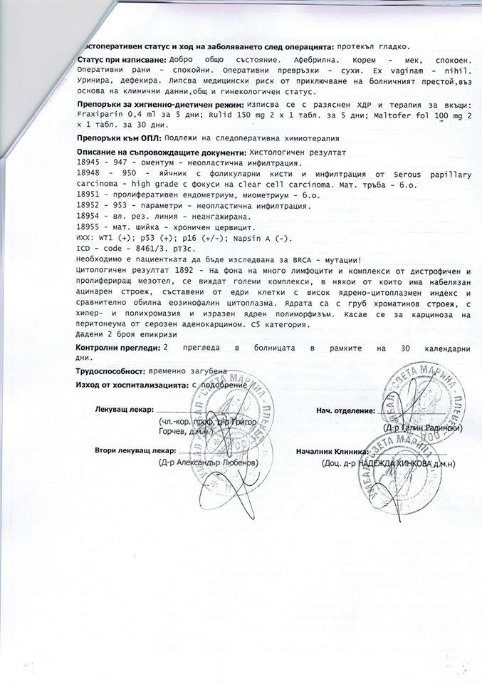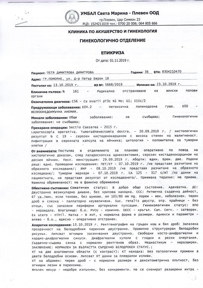 Лекарите установили, че тя има сериозен кистаденокарцином на яйчника. Веднага след това e започнала битката за живота й. Претърпяла е успешна операция.