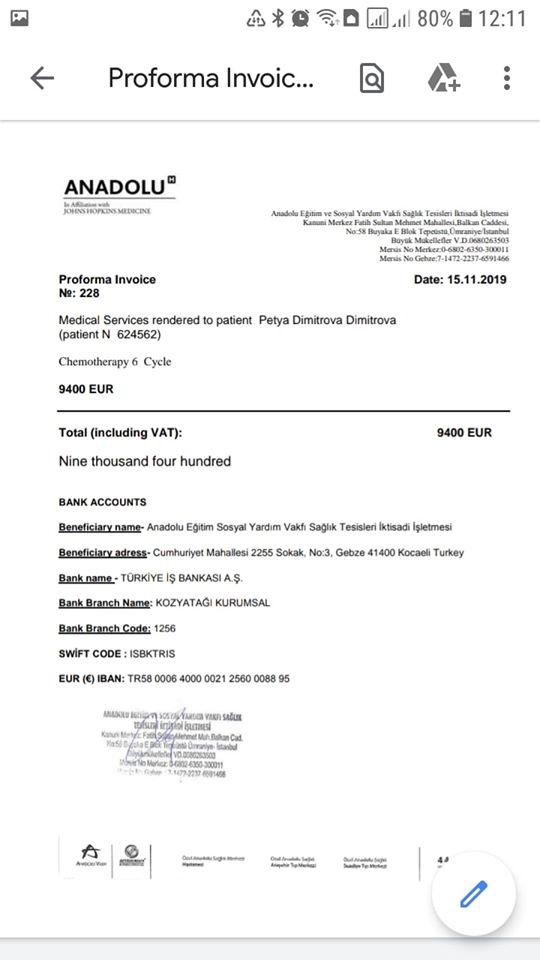 Борбата обаче не спира с това и сега бургазлийката трябва да премине през 6 курса химиотерапии в истанбулската клиника „Джон Хопкинс“. Те се правят на всеки 21 дни и са жизненоважни.