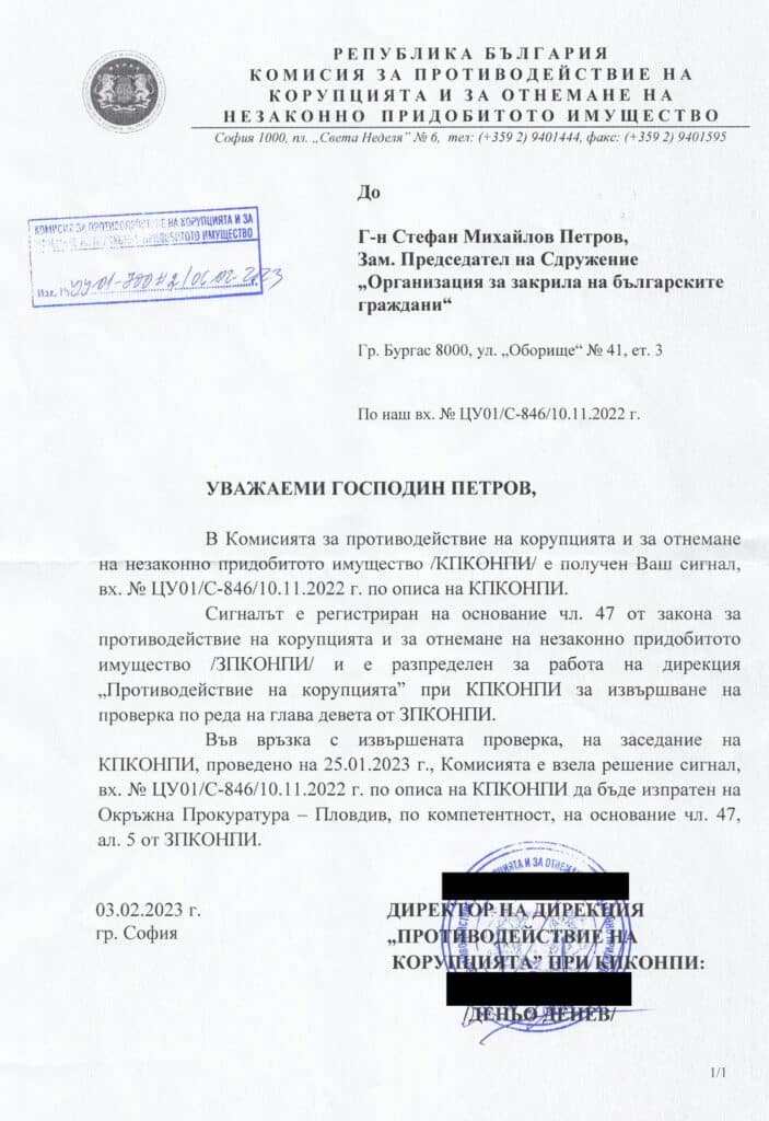 Получихме отговор от антикорупционната комисия, че сигналът е пренасочен към Пловдивската окръжна прокуратура на основание чл. 47, ал. 5 от Закона за КПКОНПИ.