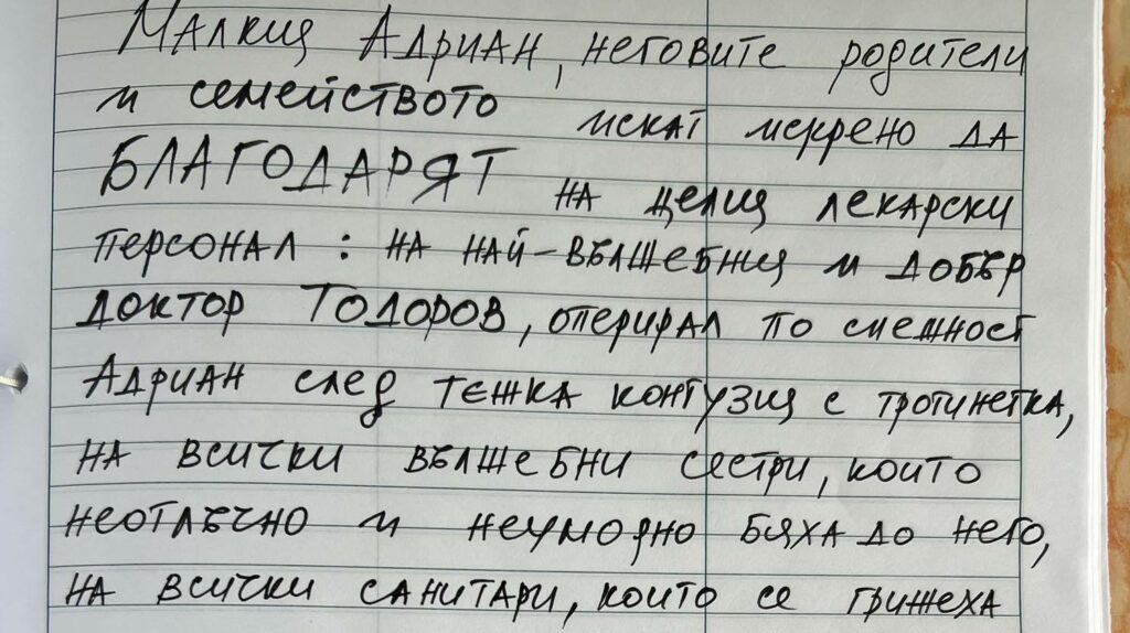 „Благодарим на целия персонал, на най-добрия и вълшебен доктор Тодоров, на всички вълшебни сестри, които неотлъчно и неуморно бяха до него, на всички санитари, които се грижеха за нас и организираха „возене“ с количка и легло. Благодарим на всички от отделението на НХО за всеотдайността, за професионализма, за положените грижи и внимание“, написаха родителите при раздялата с екипа.