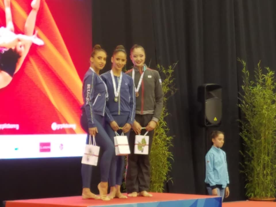 Гимнастичката ни се представи много силно и със сбор от 80.250 т. (21.300 на топка, 20.850 на обръч) зае първо място на почетната стълбичка. На второ място със сребърен медал остана Катрин Тасева.