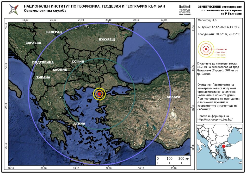 Земният трус с магнитуд М=4.6 е регистриран в района град Чанаккале, Турция. По данни на Националния сеизмологичен център към НИГГГ-БАН, събитието от 12 декември 2024 г., от 13:34 часа българско време е с епицентър на 130 км от град Крумовград и на 350 км от град София.