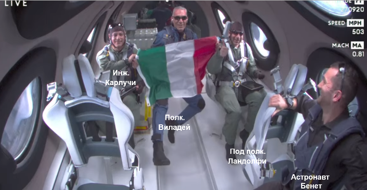 В мисията участваха двама пилоти и четирима пътници: Панталеоне Карлучи, инженер в Националния съвет за научни изследвания на Италия, Колин Бенет, астронавт инструктор във Virgin Galactic, полковник Валтер Виладей от италианските военновъздушни сили и подполковник Анджело Ландолфи, лекар от италианските военновъздушни сили.