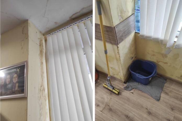 В сигнала се посочва, че в това помещение до този момент не е имало течове, но проблемът се е появил след ремонт на покрива. На изпратените снимки ясно се виждат следи от проникваща влага по стените и тавана, раздута и компрометирана мазилка, увредена подова настилка и съд, поставен да събира капките вода.
