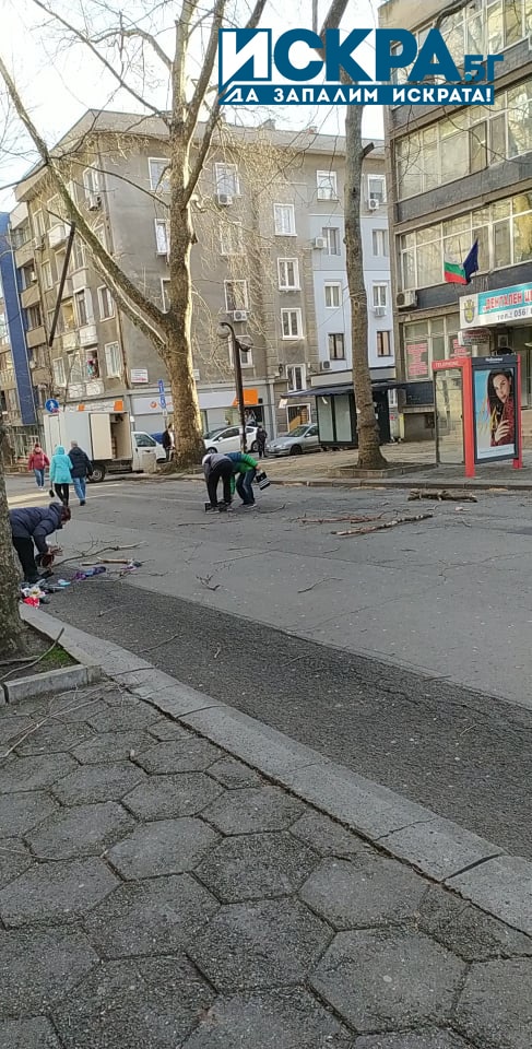 Инцидентът е станал около 16:20 часа, а клоните са паднали върху импровизирана сергия на възрастна жена, разположена на улица „Александровска“ срещу сградата на Стоматологията. За щастие пенсионерката се е разминала само с уплаха.