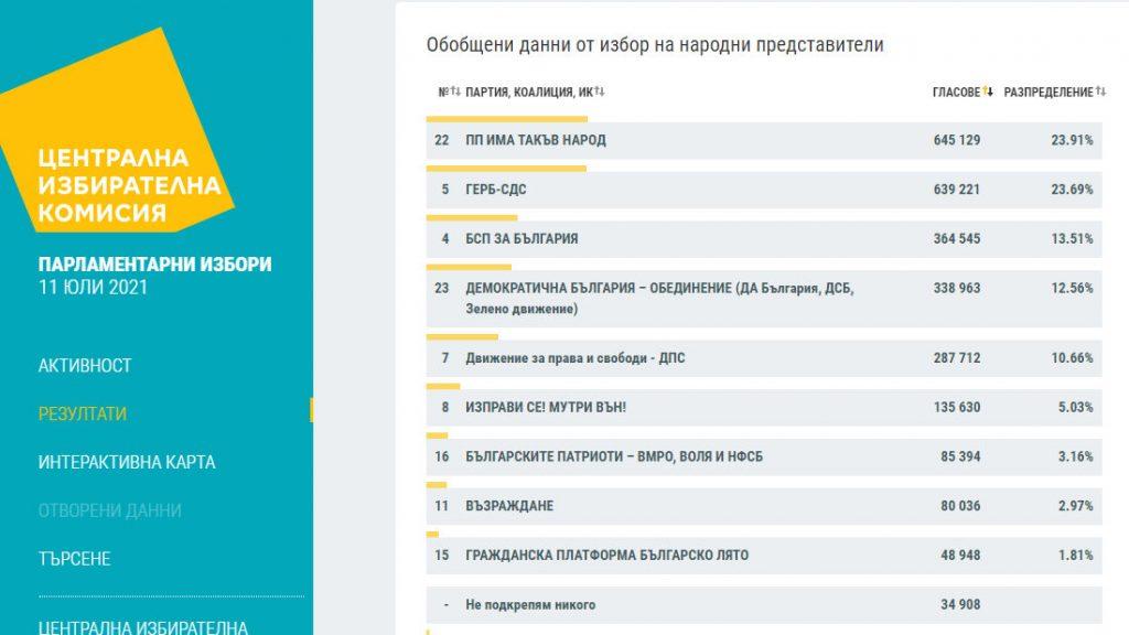 „Възраждане“ и „Българските патриоти“ са с 2,97% и 3,16%, като остават извън парламента. „Българско лято“ на Васил Божков има досега 1,81% подкрепа.