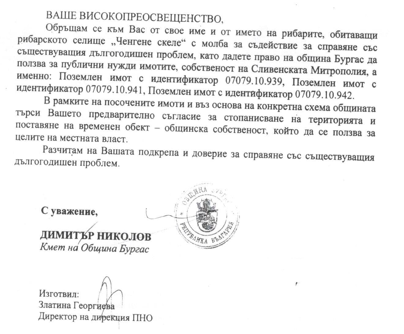 През юни 2020-а година, кметът Димитър Николов изпраща писмо до Сливенския митрополит, което завършва с искане част от земята й да бъде дадена на Община Бургас: