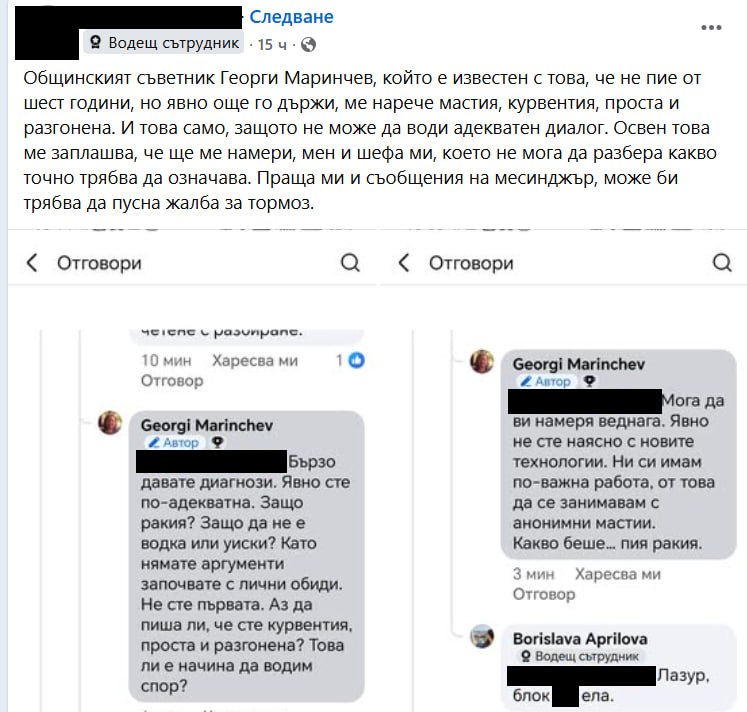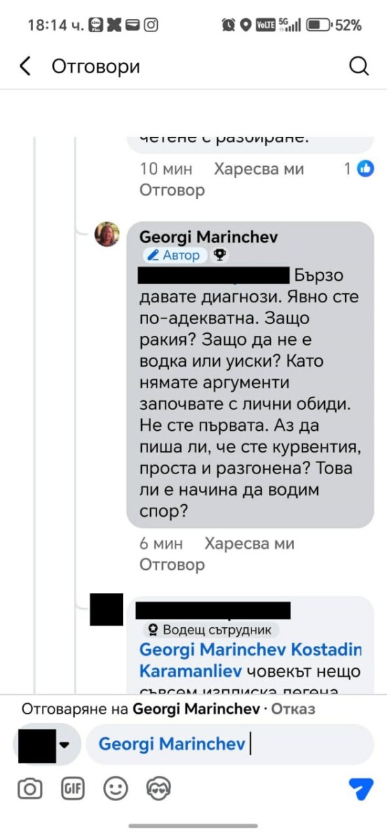 В групата „Мръсотията в Бургас“ бяха публикувани чатове между Георги Маринчев и въпросния потребител, станал жертва на вербална агресия от негова страна. От написаното се вижда, че Маринчев, известен с това, че не употребява алкохол от шест години, сам посочва, че в момента на писането пие. Освен това той твърди, че може да намери веднага потърпевшия, но имал по-важна работа, а именно да пие ракия. С цялото съдържание на чатовете можете да се запознаете тук: