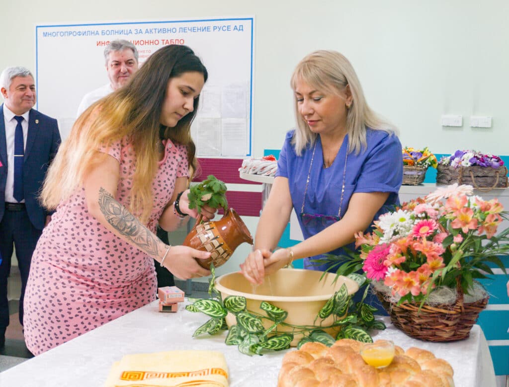 По традиция на празника беше спазен ритуалът за измиване на ръцете. В УМБАЛ „Канев“ майката на 3-дневната Белослава – Цветелина Калчева, изми ръцете на една от най-опитните акушерки – Галина Илиева, която повече от 30 години практикува професията.