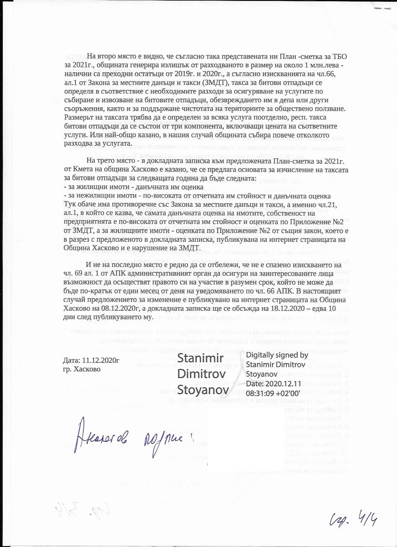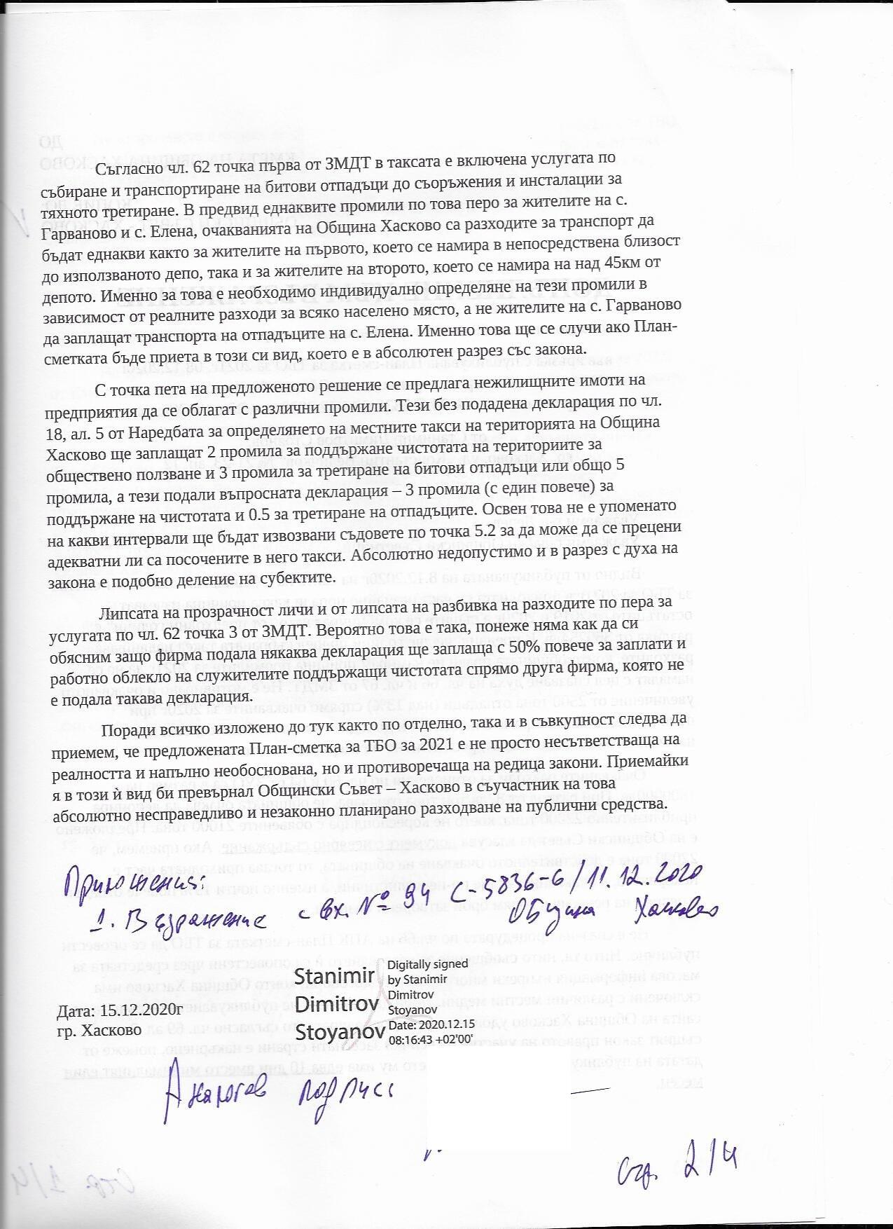 „Моето становище е, че има такива точки, които ако са внесени от някой извън групата на ГЕРБ, ДПС и „Българе за Хасково“, биват отхвърлени категорично и безпринципно, дори да има достатъчно мотиви за приемането им. За пример мога да дам предложение, което беше отправено да бъде свален като почетен гражданин Максим Стависки. Господин Стависки има влязла в сила наказателна присъда, което е достатъчно основателен довод според правилника. Какво се случи? Гербаджии изобщо не участваха в гласуването, някои се обявиха против и тази докладна не беше приета. А относно отношението на медиите към въпросния Стоянов – става тенденция, когато някой повдига въпроси, важни за обществеността, да започват негативни атаки срещу него. В Хасково има около 10 основни информационни сайта и с изключение на един, всички други получават месечна заплата от общината. Вие си правете изводите.“