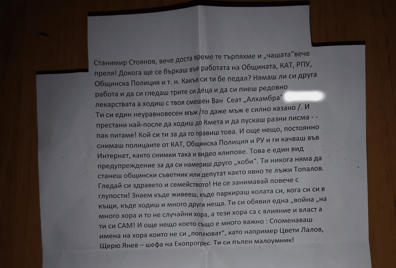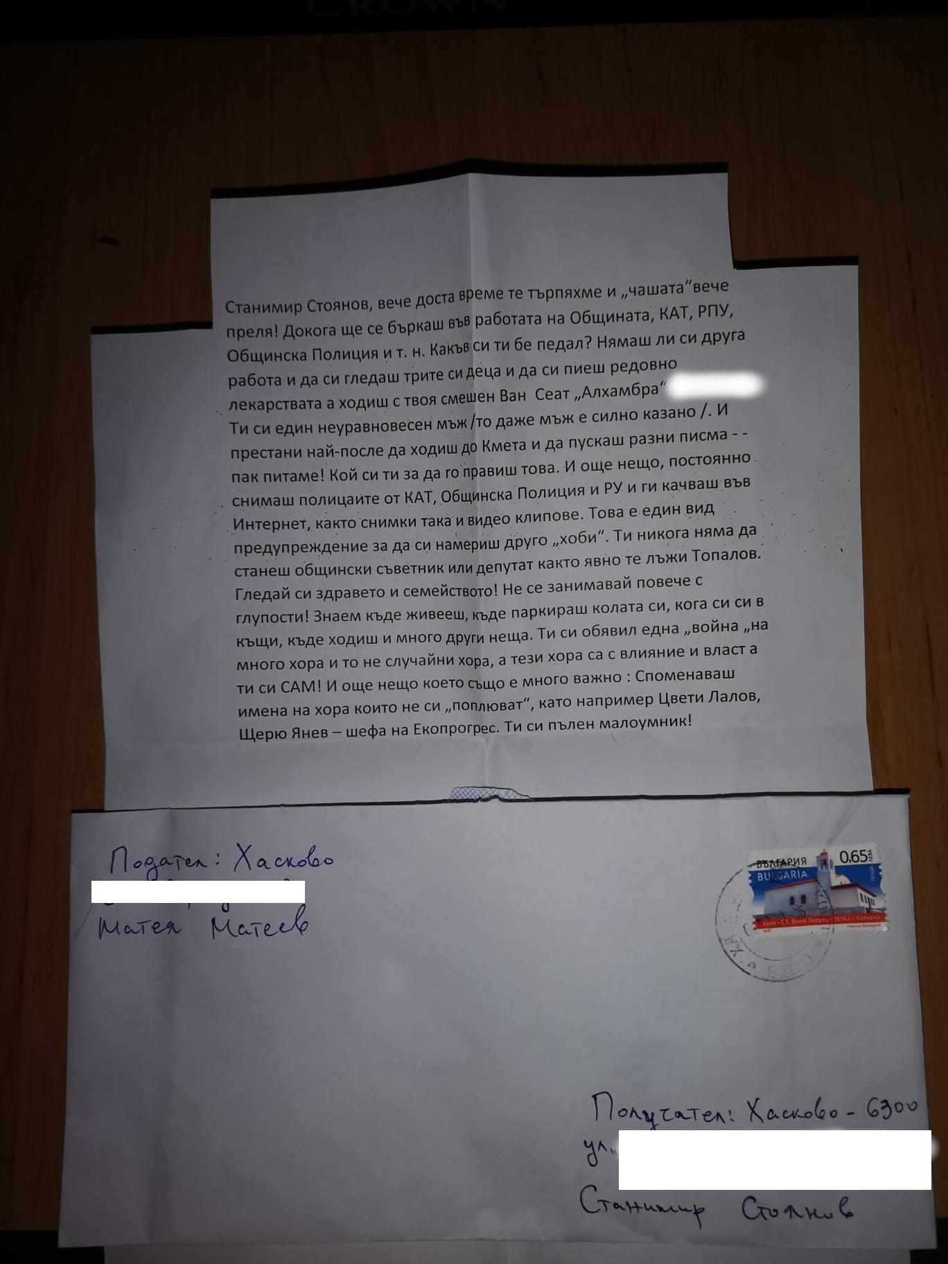 От Искра.бг потърсихме Станимир Стоянов, за да ни разкаже повече подробности около последното писмо, което е получил и публикувал във Фейсбук с открито заплашителен характер.