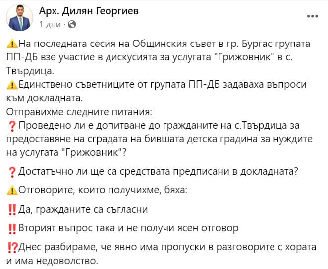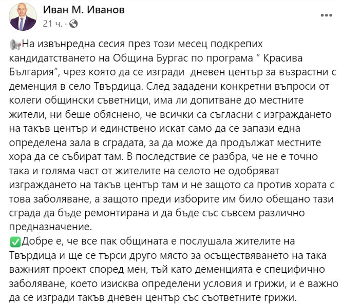 Както Искра.бг писа, през последните дни се развихря скандал в едно от бургаските села , а именно село Твърдица. Причината за недоволството на жителите е докладна записка на кмета Димитър Николов за изграждане на нова социална градина „Грижовник“ за възрастни хора, диагностицирани с деменция, в сградата на бивша детска градина в с. Твърдица.