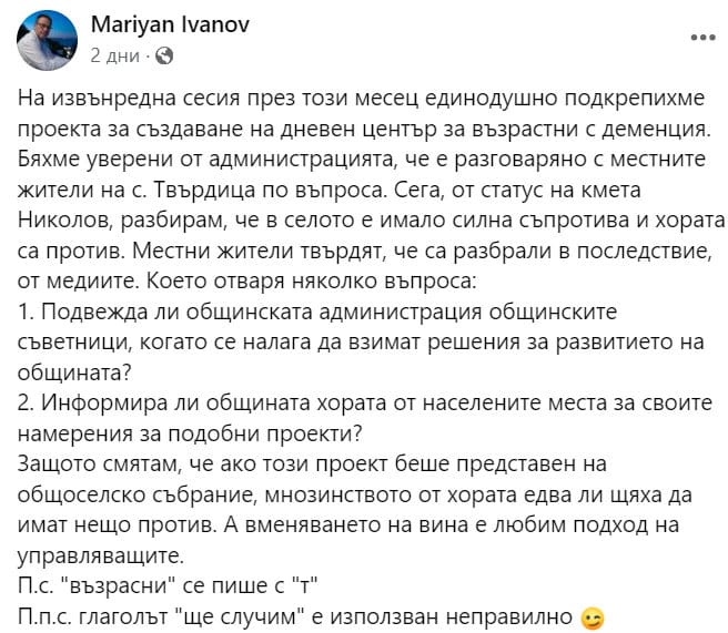 Един от съветниците, излезли с официална позиция в социалната мрежа Facebook е Иван Иванов от „Средна европейска класа“ /СЕК/: