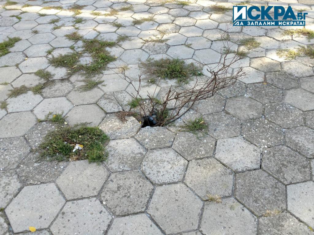 Дупка, дълбока около метър и от която стърчат пръчки, заплашва пешеходците в Бургас. Това съобщи читател на Искра.бг.