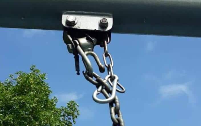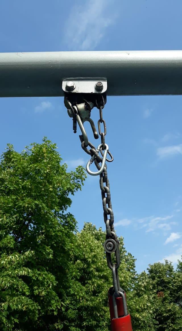 Разтревожената майка изпрати снимки до редакцията ни, на които се вижда компрометиран синджир на люлка. Той е бил „поправен“ с карабинер, но според жената няма да издържи дълго.